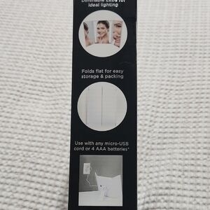 Foldable LED mirror with dimmable lights. Features 1x, 2x, and 3x magnification.