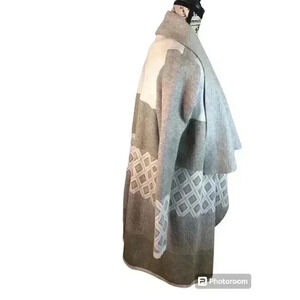 This Evolution By Cyrus sweater jacket is a must-have for all bohemian fashion lovers. The tight-knit, argyle/diamond patterned jacket is made from a warm and cozy blend of polyester, nylon, and viscose, making it perfect for chilly days. The long-sleeved cardigan has an open front and a draped design, giving it a casual and relaxed feel.