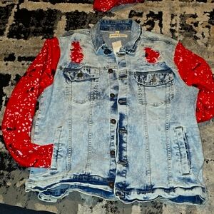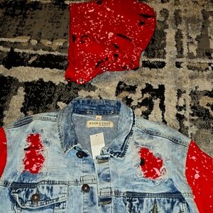 Evolution In Design Jean Jacket Unisex Distressed Denim & Red Sweatshrt Splat w/ Snap Closure Removable Hoodie