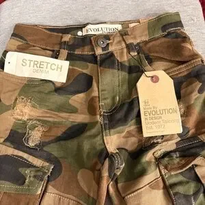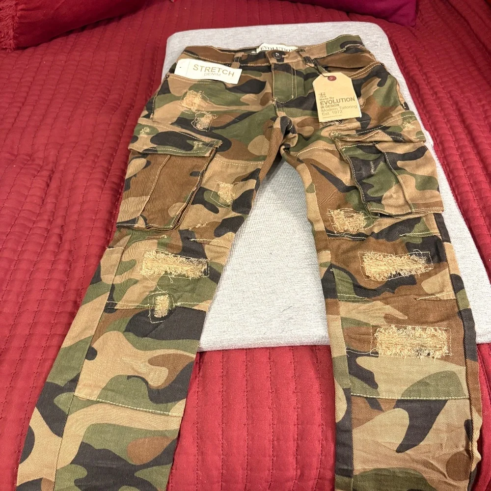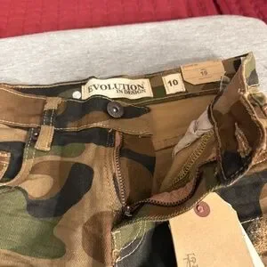 These pants are brand new never been worn tags are attached. These are the shuttle fit for these pants mid rise, slim from hip to ankle. Leg opening 12” Front rise 8 3/4” all distressing and rips were done by hand. No two jeans will be the same and they are the green camo color size 10 but the measurements are based on a size 12. From crouch to bottom hem it is approximately 24 inches long and waist is 12.5 inches wide.