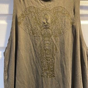 Gently worn Evolution and Creation Active Boho Elephant Tank Top womens size M. Super soft silky ribbed performance material, cutoff sleeves with drop armholes, burnout Boho Elephant print on front, high neck, oversized, flowy fit, cutout back details. Open to offers!