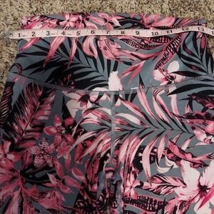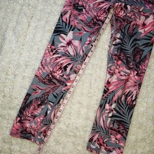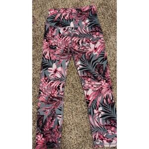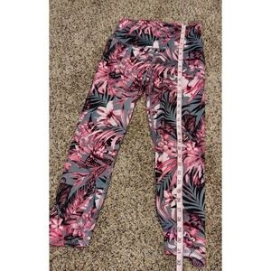 Yoga pants by Evolution and Creation. Pink. Grey, and white floral design. Preowned, no size tag. See pics for measurements. 85% polyester, 15% Spandex. Measures 13 inches across the waist, 23.5-inch inseam, and 34 inches from waist to hem. Machine wash cold. No visible rips or stains. Smoke and pet-free environment.