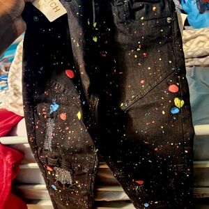 2 piece black denim boy outfit with paint splatter and distressed pants. Brand new with tags. Never worn. Great condition.