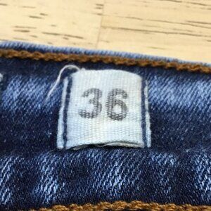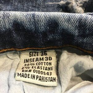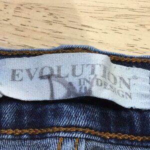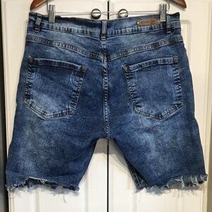 Evolution in Design blue denim cut-off shorts. Size 36. Distressed and destroyed. 98% cotton and 2% elastane. Measures 18" across waist, 11" rise, 9" inseam and 10" leg opening.