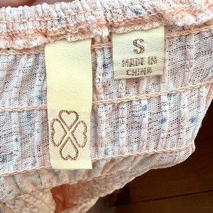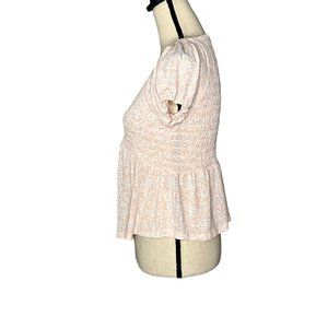 This Evolutionary Pink Baby Doll top in women's small size exudes a playful yet chic vibe. Perfect for a casual day out, its scoop neck, puff sleeves, and smocked bodice design offer a flattering silhouette.
