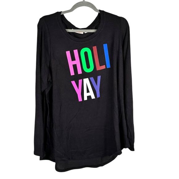 Get ready to spread some holiday cheer with this adorable Evri black top! Featuring a bright and colorful HOLIYAY graphic, this top is perfect for adding a festive touch to your wardrobe.