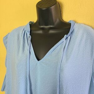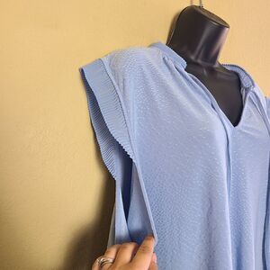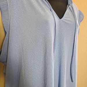 This is a light blue sleeveless top by Evri. It is textured and has ruffled details on the neckline and arm openings.