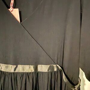 Super cute little black dress! 100% rayon. The ribbon is a great detail!