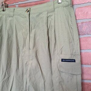 Ex Officio Womens Shorts 16 Nylon Camping Cargo Pockets Pleated Front. Light green. Approx flat measurements 16 1/2” across waist, 21” long, 7” inseam. Lightweight. Great for camping, hiking, walking, etc.