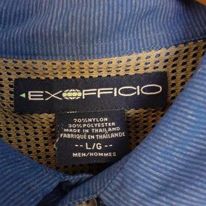 Very good pre-owned condition. ExOfficio Nylon Blend Long Sleeve Roll Tab Button Up Vented Shirt. Size: Large. Color: Blue tonal stripe. Nylon/poly blend. Machine wash. Button up front, two chest zipper pockets, back vent, and roll tab sleeves.