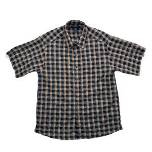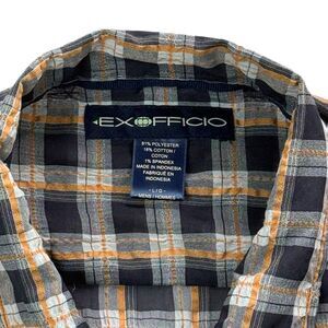 ExOfficio, technical shirt, travel shirt, quick dry, outdoor shirt, hiking shirt, casual button up, plaid shirt, summer shirt, short sleeve, performance fabric, lightweight, men's large, polyester cotton blend