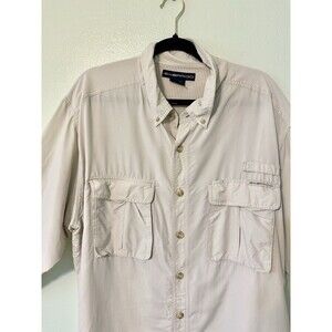 This ExOfficio men's shirt in size XXL is designed for outdoor activities. It features a beige color with a classic collared neckline and long sleeves. Made of a breathable polyester and nylon blend, this button-up shirt has a mesh vented design for comfort. It has a regular fit and includes convenient pockets, making it suitable for all seasons and outdoor adventures.