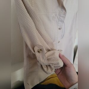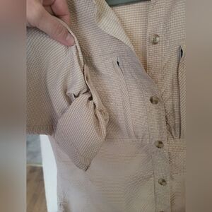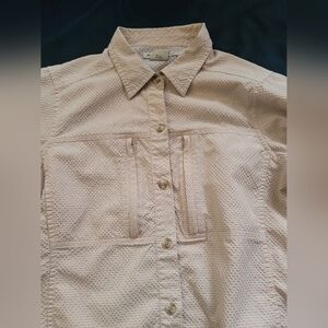 This cute shirt is a great transition piece to pull together any travel wardrobe. The sun protective Dryflylite offers moisture wicking and wrinkle resistance in a take-with-you-everywhere silhouette. Ability to roll sleeves and secure with tab or wear long!