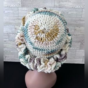 The is ruffle hat is hand crochet with I love this yard color is emerald. The yarn is 100% acrylic. One size fits most