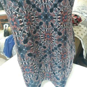 Exc RUFF HEWN GREY LINE SHORT SLEEVED VELVET KNIT TUNIC SZ MED. So soft and simple. The photo does not do the top jusyice. Pattern and colors are beautiful. U cutout at neck with a bar across opening. Short sleeve tunic length with shirttail hem and slits at each sideseam. 42" across the bust, 44" across hip and the length is 29". Condition is "Pre-owned".