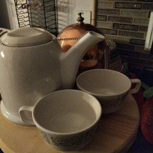 Exc Vtg Teapot w.copper thermal cover tea steeper 3 Homer Laughlin teacups bonus