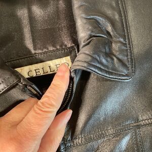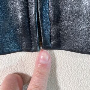FEATURES/ACCENTS: Black Leather, full zip, collared, side slit pockets