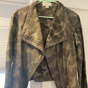Excellent condition Anthropologie Marrakech camo lightweight jacket with detail. Approximately hip length. Greens and browns, zipper front, detailing at back. Size Small