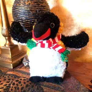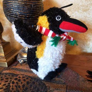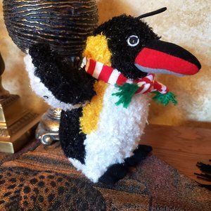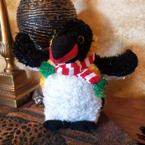 Excellent Condition Vintage Christmas Penguin Decoration---He looks great under the tree on presents, in a holiday vignette, on the mantle with other decorations, just anywhere really, he's a Christmas Classic! The Christmas Penguin is made is sparkly black and white material to mimic the icy conditions he lives in, he measures 7 inches tall and with his wings open is 9 inches wide. Around his neck is a red and white striped scarf with green fuzzy trim to keep him warm! He does have an ornament loop on top of his head so he can easily be placed on your tree as an ornament. Weighs: 4 oz.