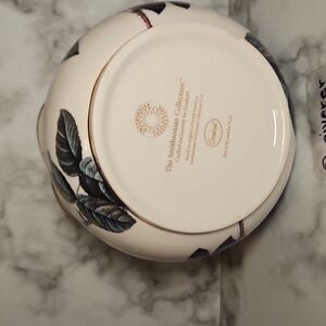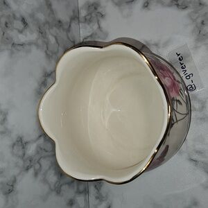 • The rim has a decorative, scalloped edge with gold trim accents