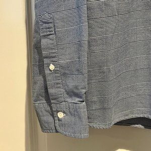 Excellent Quality Brooks Brothers Red Fleece checked dress shirt - Size Large. Material is great quality. Navy and white checked pattern. Faded initials on the tag but zero other flaws. EUC. 100% cotton.