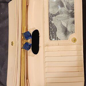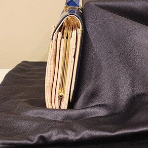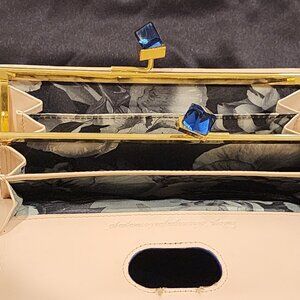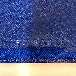 This beautiful wallet has been sitting in my closet with some areas of wear and tear. DESCRIPTION A sleek yet functional piece, this elegant Ted Baker London Liquid-shine patent glosses a sleek leather wallet distinguished with a peekaboo kiss-lock clasp. An ideal companion for any occasion because of the versatility it affords, it can be transitioned from day to evening wear. It is crafted from soft patent Navy and smooth light pink leather, and features a decorative Navy Crystal coin interior that makes this a distinguished piece. Ample interior compartments make it work as either a wallet or mini-clutch. • Snap-flap closure. • Back: Exterior zip pocket. • Interior currency and coin pockets; eleven card slots; ID window. • Leather. • Logo detail on front • Gold tone hardware • Lining: Signature lining. • Spot clean • By Ted Baker London; imported. SIZE • 7 ½"W x 4"H x 1"D (approximate) This package includes: • Ted Baker London Patent Navy Crystal Wallet • Ted Baker Dust bag not included ***Reasonable Offers Welcome!!***