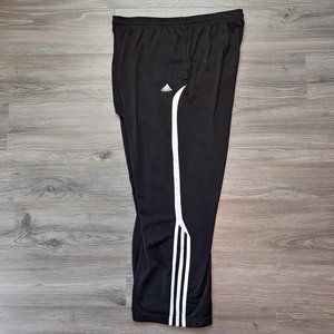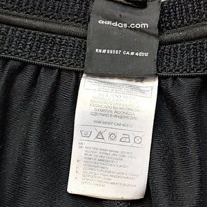 Excellent Used Condition Men's Adidas 3 Stripe Athletic Pant Black Size Medium. Larger old school style cut tag says 2010. Worn many times to the gym and for casual wear. No holes, rips, tears or stains. White mesh panel on side with signature 3 stripe logo below the knee allows for breath-ability and airflow. Loose fit through leg. No zipper at pant leg opening as these are more of a sweatpant style. Logo on left pocket has a bit of wear as shown in detail pic but does not affect usage. Drawstring waist. 100% Polyester. Measures 16 1/2 inches wide at waist (33 inches) unstretched and can fit up to a 36 inch waist comfortably. 29 inch inseam. Measurements are approximate and taken when the garment is laying flat. Machine wash with like colors.
