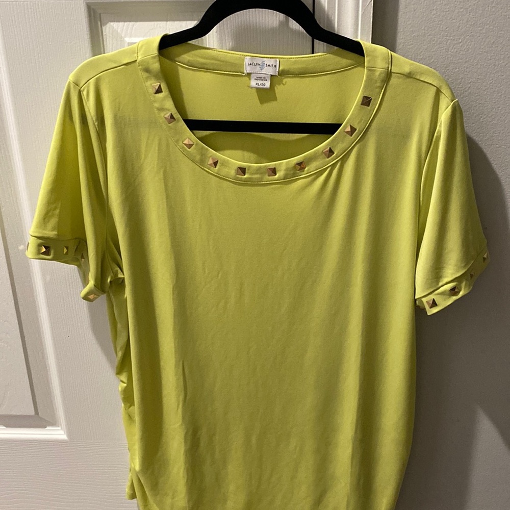 Gold studded neckline, and also around sleeves pretty lime green color, gathered stiching on both side of shirt , excellent condition