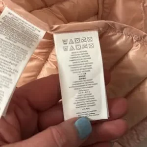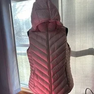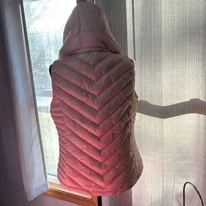 Puffer Vest with removable hood. It is a pink/peach in color