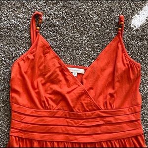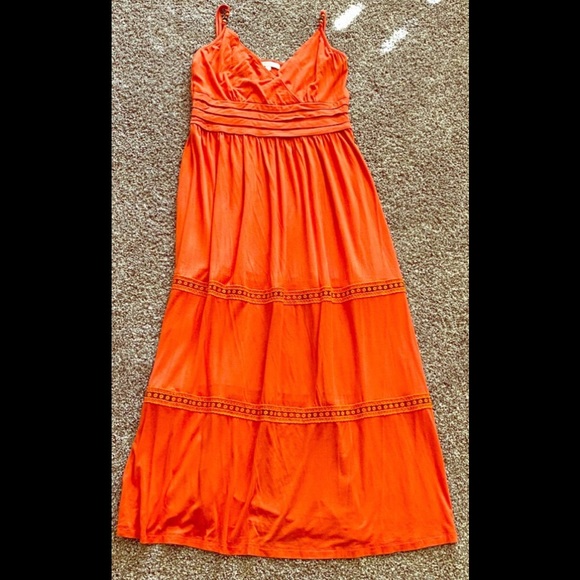 Excellent condition orange maxi length nursing dress by Annee Mathew from Singapore. Beaded details on spaghetti straps; ribbon lace on bottom; plating on mid part. Beautiful dress and such a great color and flow