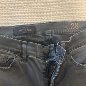 Excellent condition J. Crew toothpick pants. Size 28. Grayish blue color, very soft jean material. I’m 5’5” and they hit at my ankle.