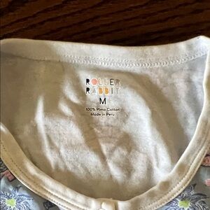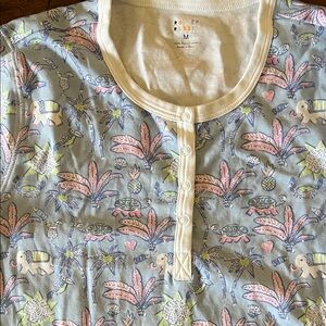 Like New Roller Rabbit Pajamas. Light blue with pink, green, and navy tropical design print… palm trees, elephants, turtles, crabs, etc. This is my favorite roller rabbit print!