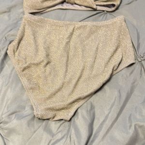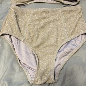 Purple gray color with metallic gold sore is. Padded top with bow at front. Full coverage bottoms