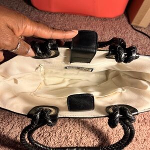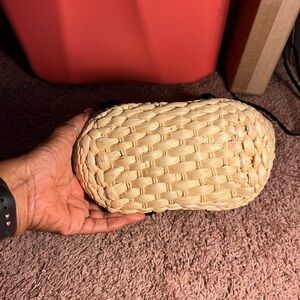 This beautiful straw bucket handbag has two straps, with a magnet closure. There is two inside pockets one with a zipper and the other has a separated pocket to hold sunglasses and a cell phone. The color is retro straw with Black trim on top.