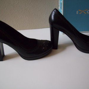Exchange by Charles David size 8 round toe black platform heels with metal and embroided accents, some minor wear, comfortable shoe
