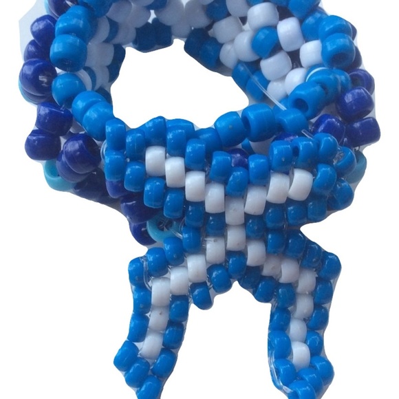 Beaded X is the central theme for this Mini UFO neon blue and white kandi cuffs. This kandi bracelet is made out of pony beads and stretchy string. I use 30 beads around the wrist so it will fit most wrists of 6-8 inches IF you need a different size I can work with that.