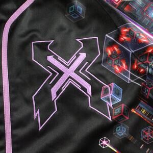 Color/Design: Black base with purple piping and vibrant neon geometric allover print