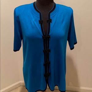Blue acrylic jersey knit trimmed in black. Round y. Short sleeves. Embroidered button front closure. Side vented hemline. Size tag missing. Stylish & classic. EUC