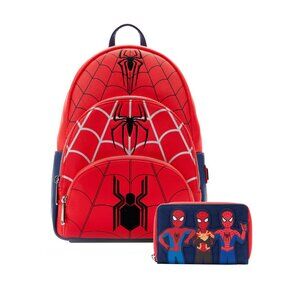 NWT -Your friendly neighborhood Spider-Men are swinging in to save the day! The Loungefly Spider-Man Triple Pocket Multi Logo Mini Backpack brings three Peter Parkers together across a web of space and time. On the front, zippered pockets display the suits of Peter #1, Peter #2, and Peter #3. On the back, the phrase “I love you guys” appears next to the three heroes. This mini backpack brings a triple threat to any outfit and will keep your crime-fighting essentials safe as you sling through any adventure.