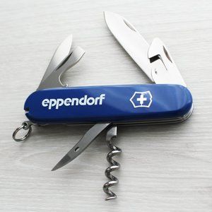 Super rare and exclusive 'Spartan' Eppendorf blue swiss army multitool knife by Victorinox. This knife is made of stainless steel and has 6 different tools, including a small knife blade, a large knife blade, corkscrew, can opener with small screwdriver, bottle opener with large screwdriver and wire stripper, and punch reamer with sewing eye. There is also a pair of tweezers, a toothpick, and a keychain ring on one end. This swiss army knife measures approximately 3.5" width x 1" length x 0.5" depth. In excellent pre-owned condition - this multitool knife was taken out of the box (which has a dent in one corner), but none of the tools were ever used. There are some minor scratches and scuffs to the outer surface. This swiss army knife is compact, versatile, and classic! This would make a great gift for any outdoor enthusiast, or those who are fans of research science, forensic science, microbiology, molecular biology, biochemistry, immunology, medical research, etc!