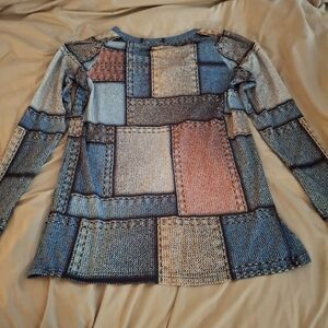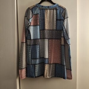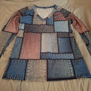 This stylish patchwork V-neck blouse features a blend of blue, pink, and cream colors. Perfect for adding a unique touch to your wardrobe.
