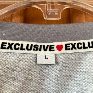 Stylish and comfy long sleeve top by Exclusive in a modern gray and black abstract pattern. Soft stretch fabric, crew neckline, and easy fit—perfect for casual wear or layering. Size L. Gently preowned, great condition. See photos for full details.