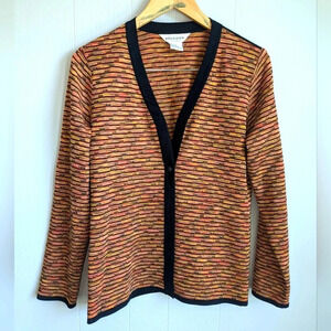 This Misook Autumn Cardigan in Petite Small features a beautiful blend of orange, rust, and black, perfect for Thanksgiving and fall. It measures 19 inches across the armpits and 27 inches in length, and is in excellent condition.