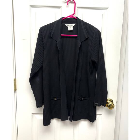 This Exclusively Misook sweater is a black cardigan with metal detail at the sleeves and faux pockets, and shoulder pads. This is a classic, elegant, black knit sweater that goes with it all. Perfect for that capsule wardrobe. It is a petite size medium.