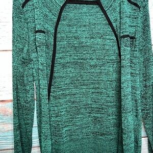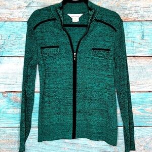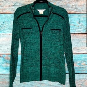 Exclusively Misook full zip jacket. Size small. Acrylic. Green. Trimmed in black. Stretchy. Dressy look. Great preloved condition. Mock neck. Flattering fit. Mid weight outerwear for fall / winter. Long sleeves. Great for holiday / Christmas events.