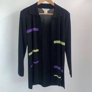 Black sweater with green and purple stripes