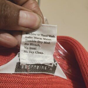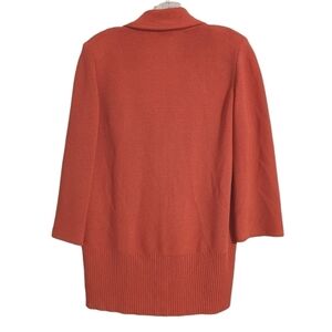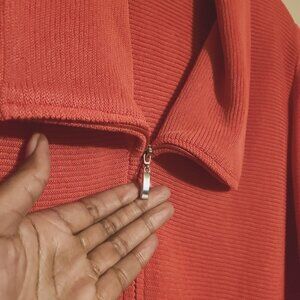 Women's pink, ribbed, full-zipper cardigan sweater by Exclusively Misook, size small. Sweater pull is silver; sweater includes shoulder pads. Excellent pre-owned condition overall; some small snags. Please see close-up pictures for more details.