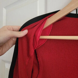 Beautiful red and black cardigan with thin shoulder pads that can be removed if desired. Does not have any closures. Stretchy material