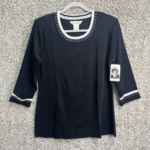 New with Tags Women’s Exclusively Misook Black with White Trim 3/4 Sleeve Stretch Knit Top in Size Small