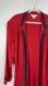 Deep red open front knit jacket has accent black striping along collar, front opening, and sleeve cuffs. Ribbing on collar and along front opening. Slightly padded shoulders add structure. Large side vents. Relaxed, comfortable styling makes it a perfect addition to any wardrobe.